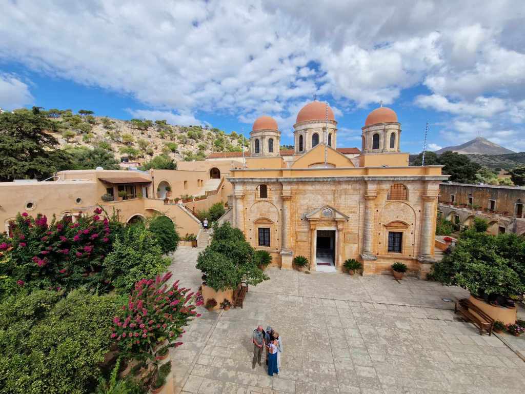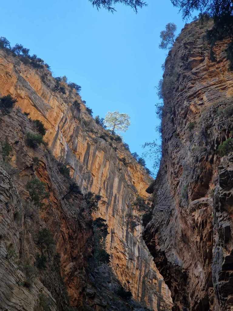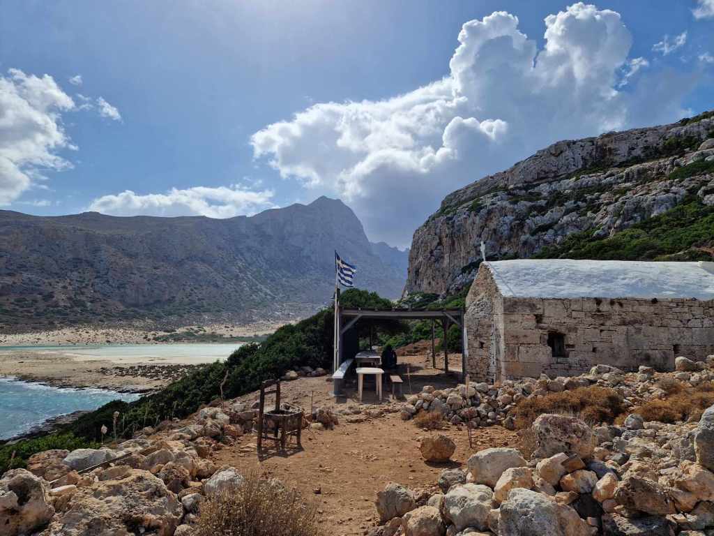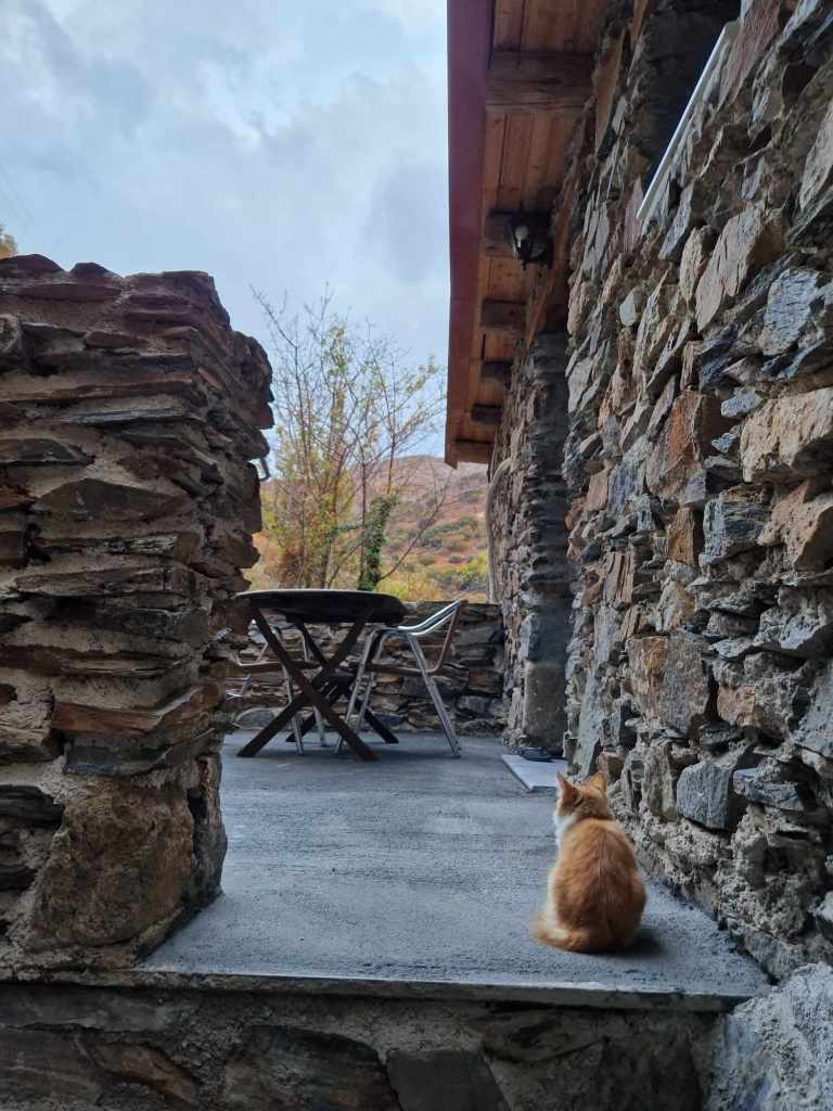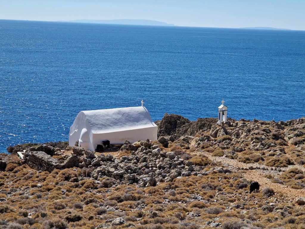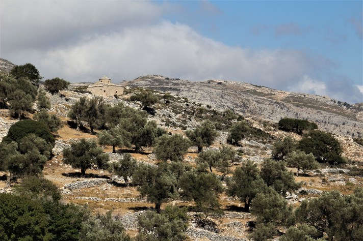 Le temps d’une pause, nous poursuivons notre randonnée par les jardins du village pour atteindre l’église byzantine de Kiriaki bâtie en pierre sèche.