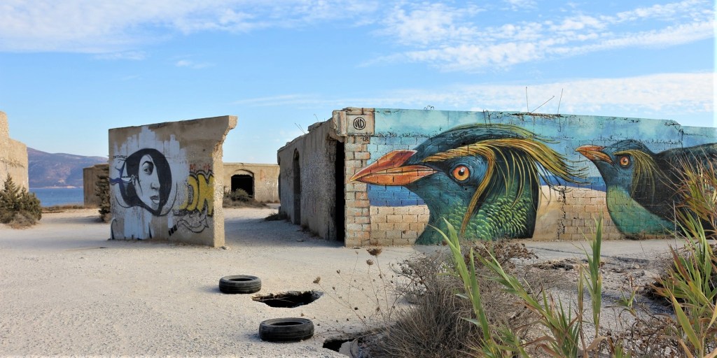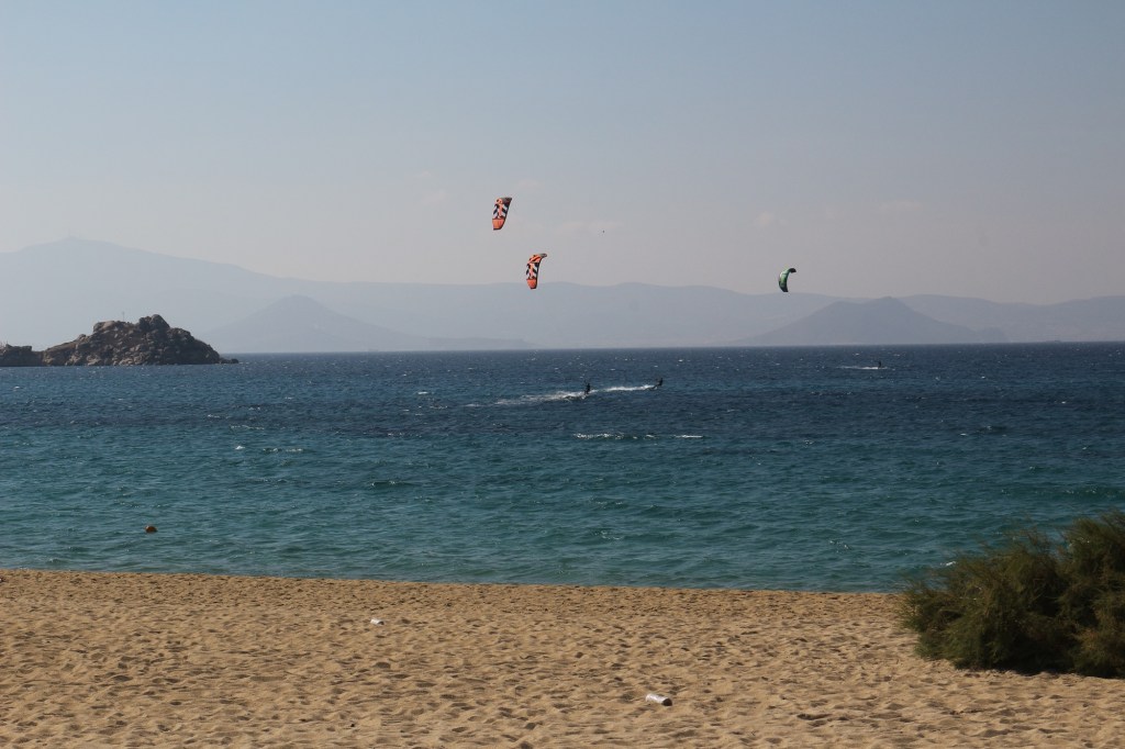 Passage à Mikri Vigla pour observer les kitesurfeurs du jour. Coup de cœur pour les plages autour de Aliko qui garantissent un superbe coucher de soleil. Et découverte d’un hôtel abandonné où de magnifiques graffitis ornent les murs.