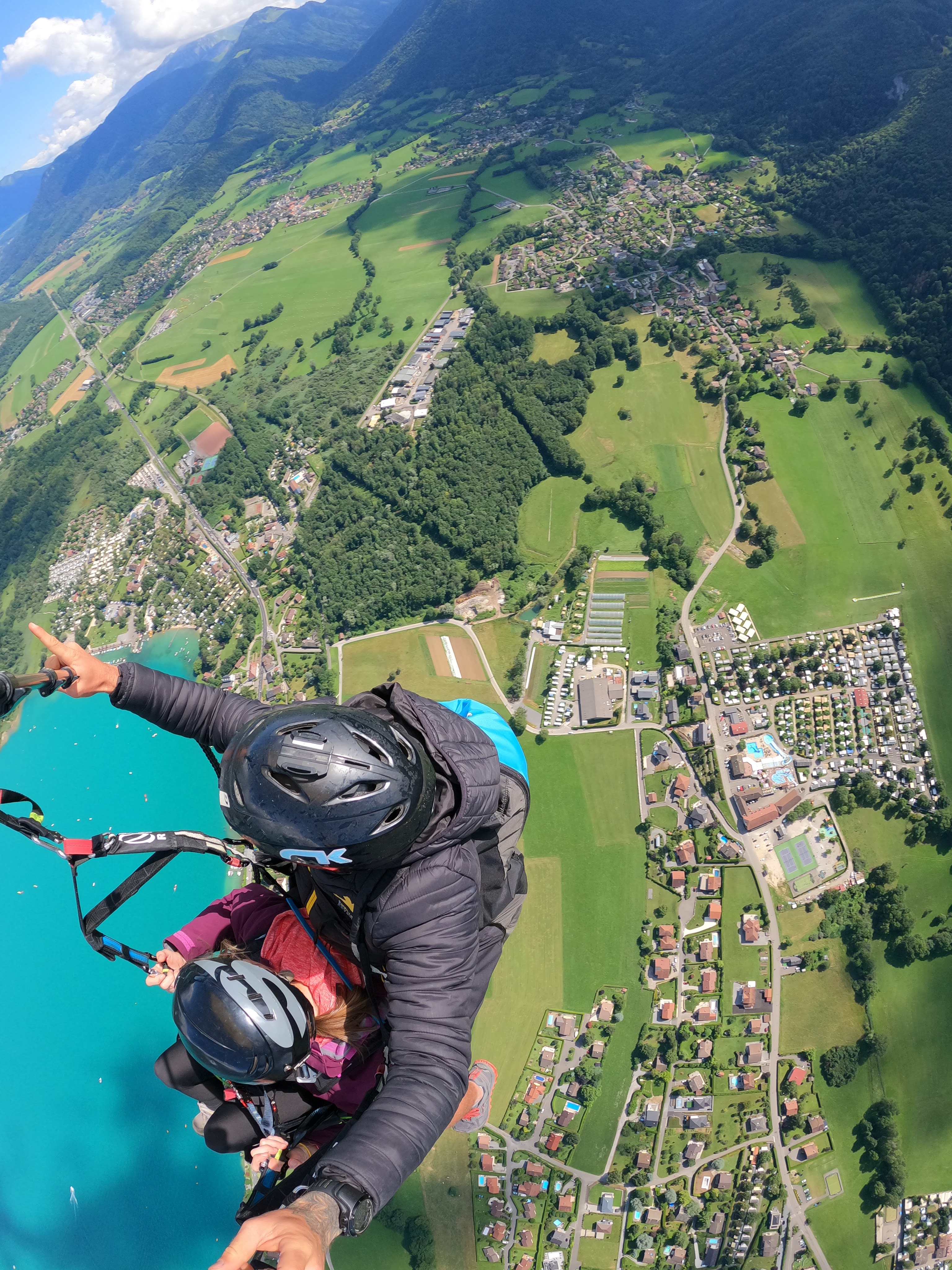 On se rapproche des sommets, on croise d’autres parapentes au-dessus ou en-dessous de nous. On aperçoit même en contre bas l’envergure des oiseaux, la cime des arbres… Pour ce premier vol, il s’agissait d’un vol prestige compris entre 35 et 45 min dans les airs. Le temps de profiter pleinement des sommets et de la vue sur le lac.