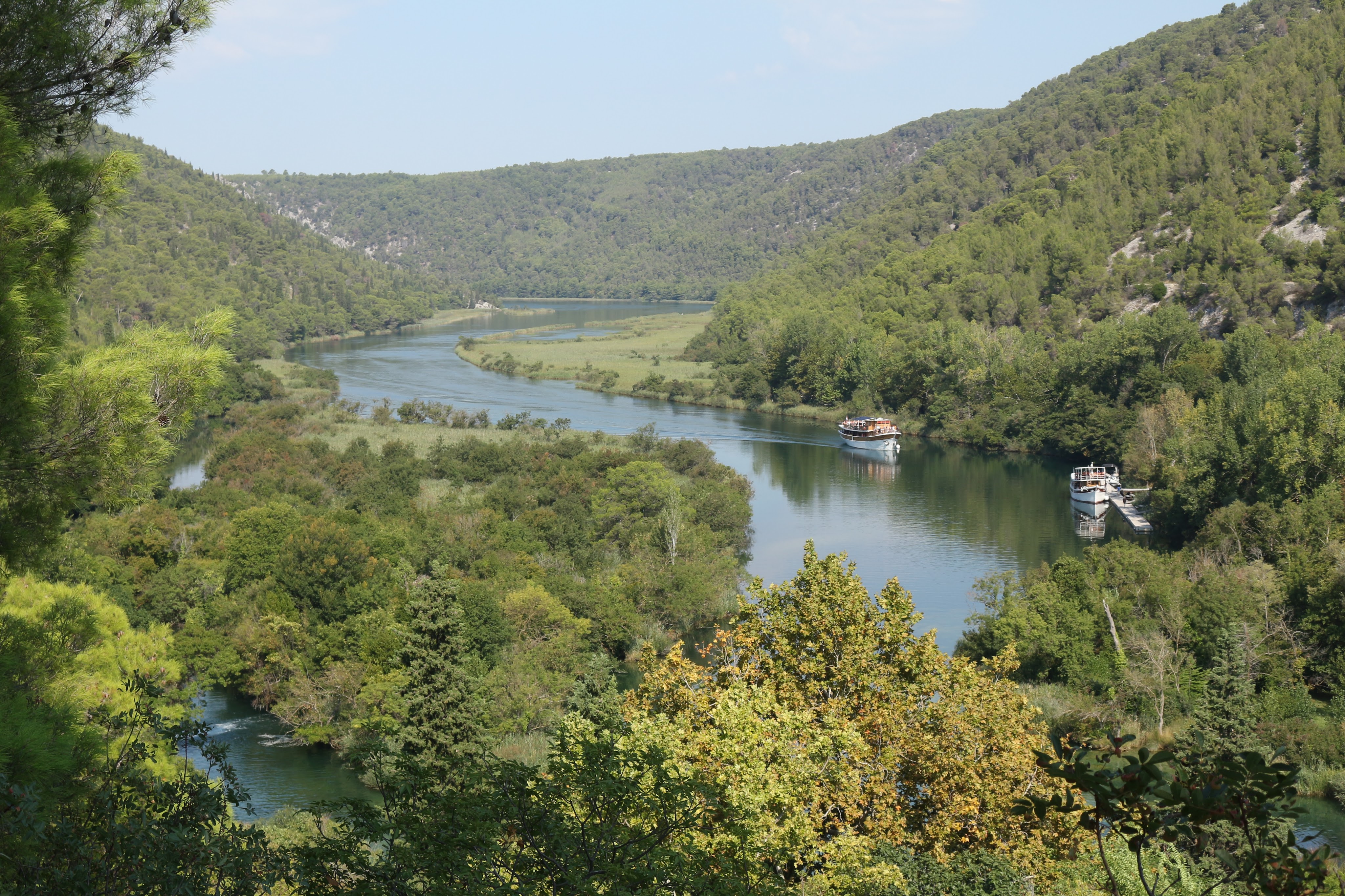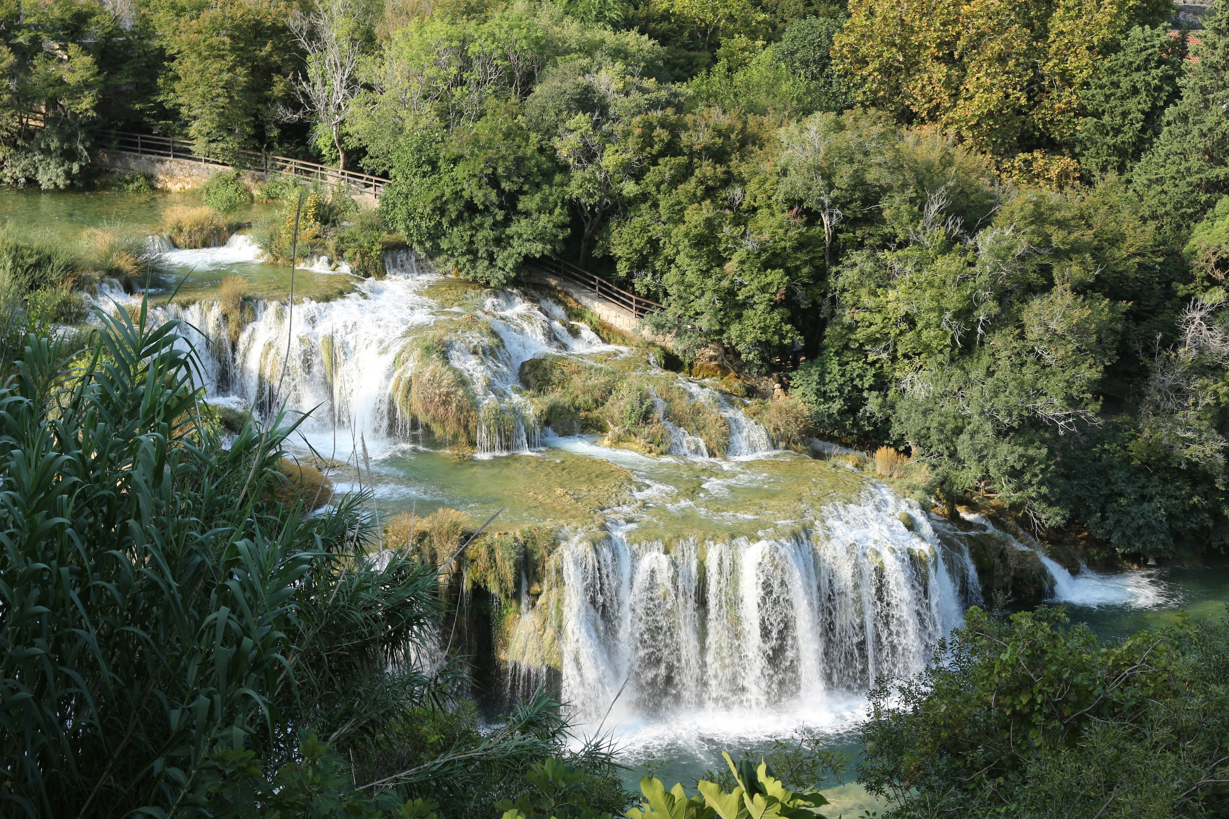 Nous avons commencé la visite par l’entrée Lozovac. Pendant moins d’une heure nous déambulons sur des pontons en bois au milieu du végétation luxuriante qui contourne l’eau. L’intérêt de commencer par cette entrée est de faire le tour du parc en finissant par le clou du spectacle : les fameuses chutes de Skradin.