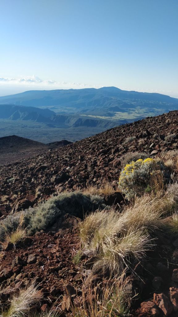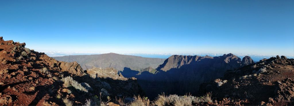 Pendant 1h30, nous profitons du sommet, du spectacle et des vues sur l’île. Un caillou au milieu de l’océan indien c’est comme cela que certains désignent l’île de La Réunion. Et bien il faut prendre de la hauteur pour s’en rendre compte. L’île intense est si petite mais grandiose à la fois !