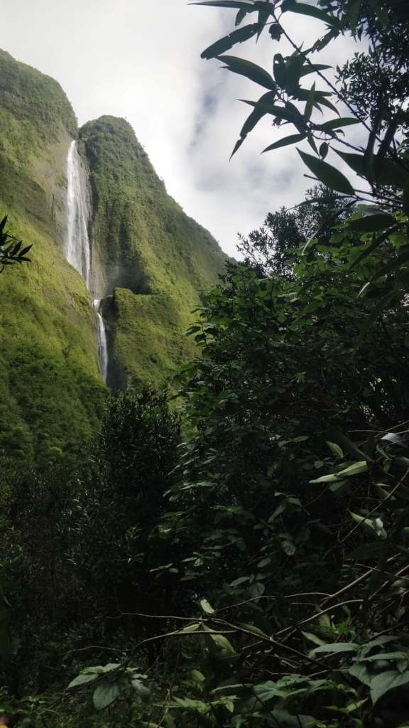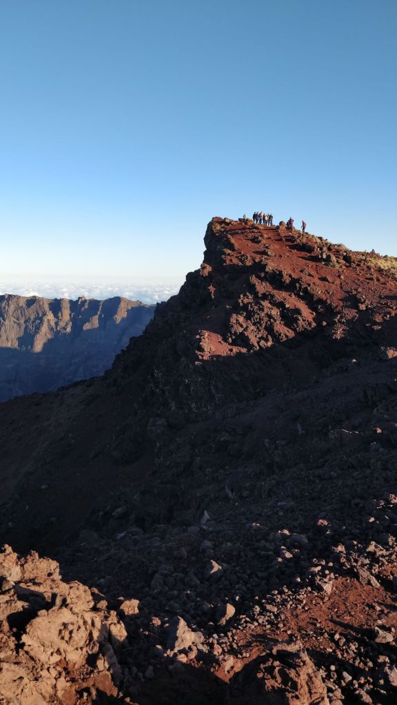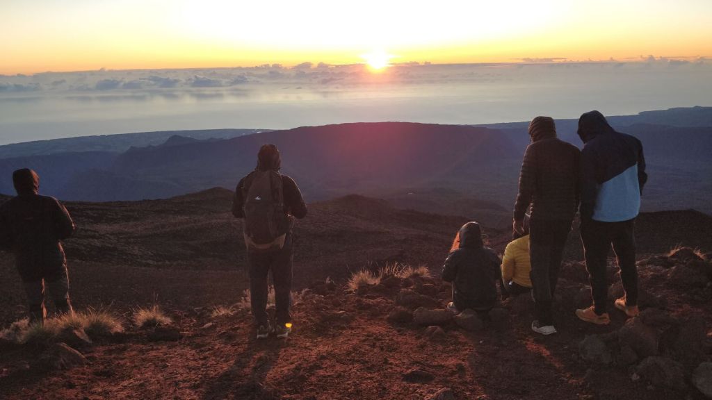 Nous sommes aux premières loges pour admirer le lever de soleil sur le toit de la Réunion. Que le spectacle commence… Le soleil pointe le bout de son nez au dessus des nuages sur l’océan, ses premiers rayons commencent à nous réchauffer. Puis les paysages aux alentours se sont illuminés. Nous admirons le Grand Bénare, le cirque de Cilaos, la plaine des cafres, le volcan, Takamaka, une partie de Salazie, Marla… C’était grandiose !