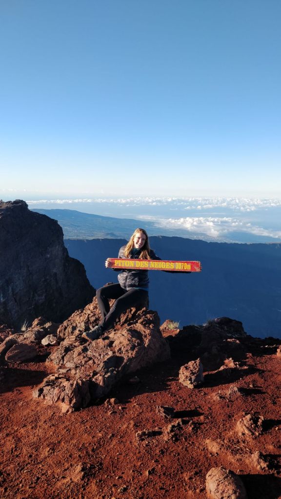 Les premières lueurs du jour apparaissent vers 5h30. Le relief aux alentours se dessinent petit à petit. Nous ne sommes pas les seuls à gravir le piton des neiges ce jour là. On entend les bruits de bâtons qui nous rattrapent derrière nous. Puis dans la montée chacun prend son rythme. Rendez-vous au sommet. Dernière ligne droite… et nous arrivons à 3070m d’altitude au sommet du piton des neiges vers 6h15. Il fait un froid glacial. Pas une minute à perdre, j’enfile ma doudoune (oui oui vous avez bien lu une doudoune), des gants et un bonnet.