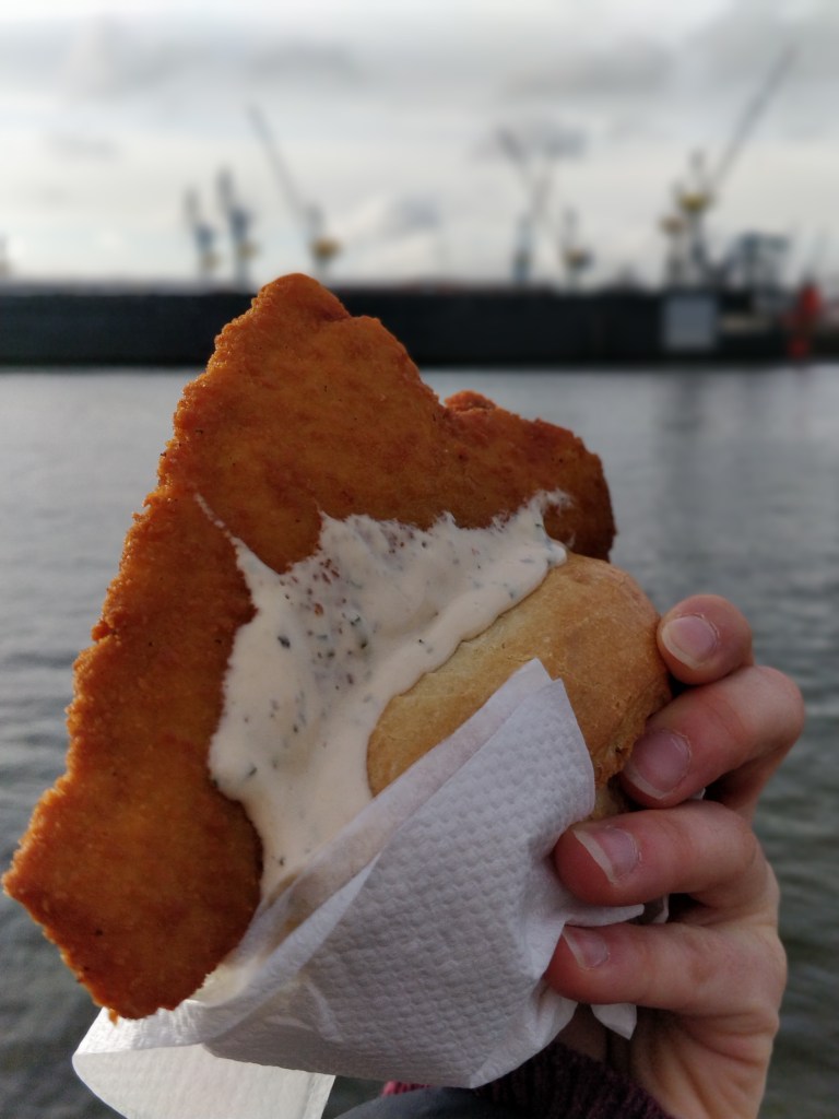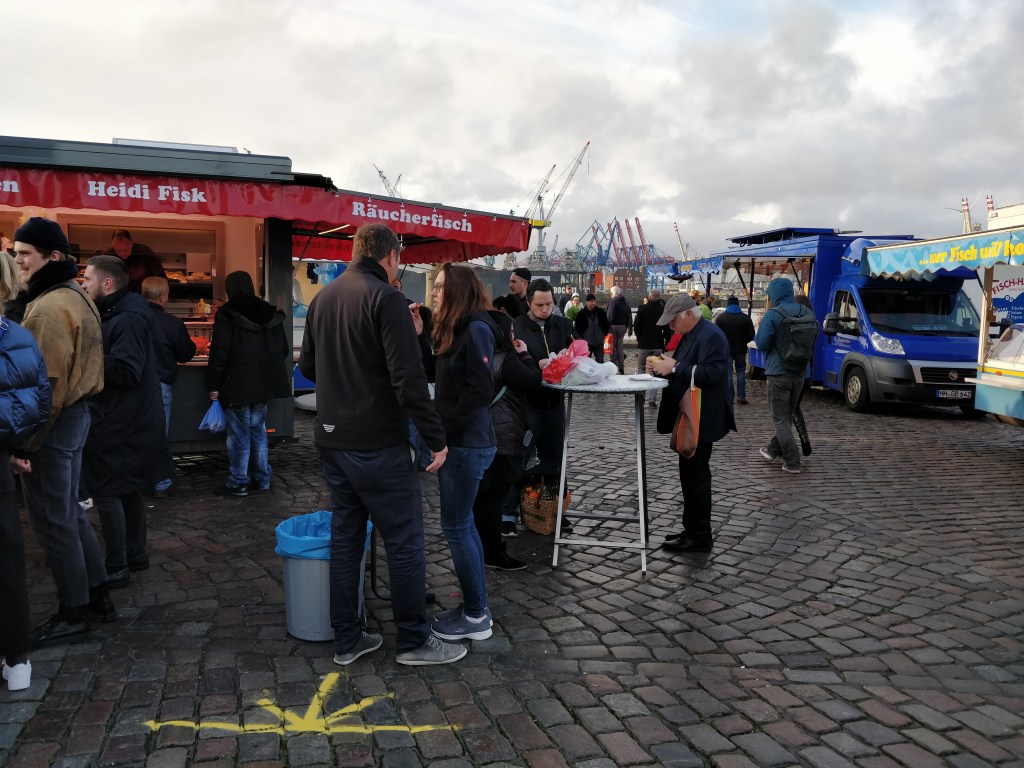 Pour encore plus se fondre dans la masse, il vous faudra vous aventurer du côté des étals de sandwich aux poissons. Car la tradition ici c’est de venir déguster un Fischbrötchen (poisson dans du pain) de bon matin face au port d’Hambourg. Il suffit juste de se lancer car je vous assure qu’il n’y a rien de mieux qu’un bout de pain, du poisson et une bonne petite sauce (au raifort) pour bien commencer la journée. Testé et approuvé à 9h du matin le dimanche 31 mars 2019. C’était au stand « Marx und Sohn ». Donc si vous avez l’estomac bien accroché et que vous voulez vivre une expérience atypique, direction le Fischmarkt à Hambourg le dimanche matin. Guten Appetit !
