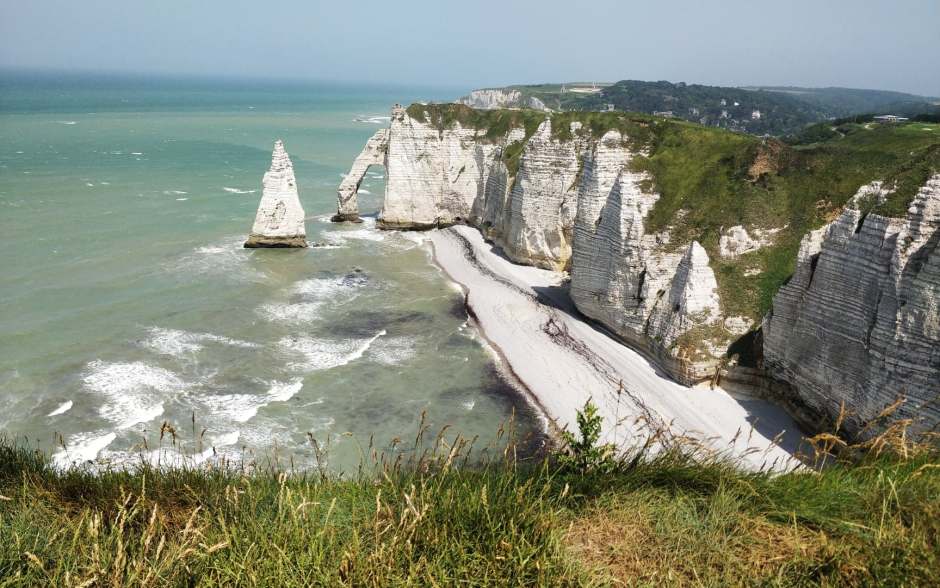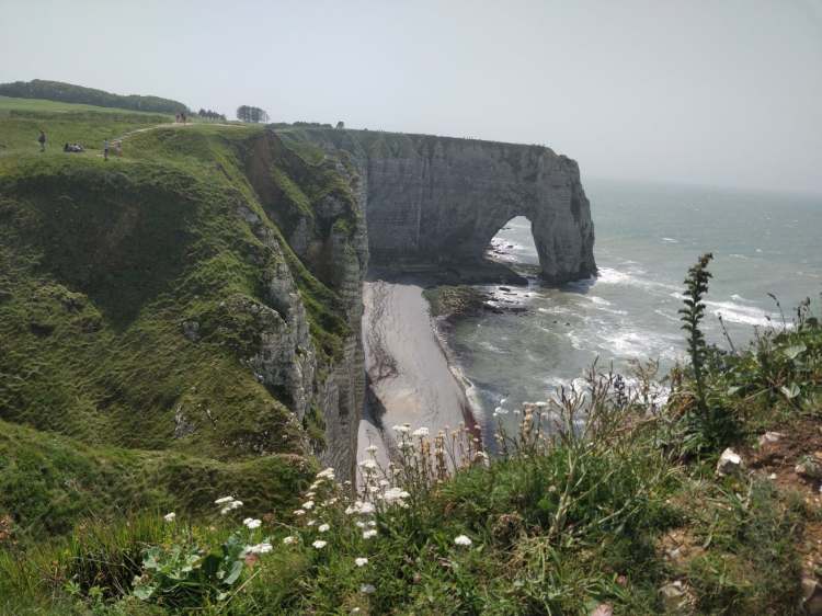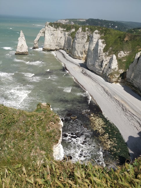 Puis nous reprenons la route pour les falaises d’Etretat. Pour se garer nous privilégions les hauteurs de la ville là où les places restent encore gratuites. Puis nous grimpons les escaliers qui mène sur les falaises d’Etretat. Belle balade sur les hauteurs pour admirer sa falaise d’Aval qui chevauche fièrement la Manche et son aiguille qui culmine à 71 mètres un peu plus loin. Je vous conseille de poursuivre votre promenade jusqu’à sa deuxième arche, la Manneporte. Puis plus loin, vous pourrez admirer la pointe de la Courtine. Vous pouvez continuer votre balade sur les falaises ou bien retourner profiter de sa belle plage de galets. Après une pause bercée par le bruit des vagues, vous pouvez partir à l’opposé des célèbres falaises pour grimper jusqu’à l’église Notre-Dame-de-la-Garde qui offre une super vue sur la falaise d’aval d’Etretat (dernière photo). Ce jour-là le vent soufflait très fort sur les hauteurs d’Etretat.
